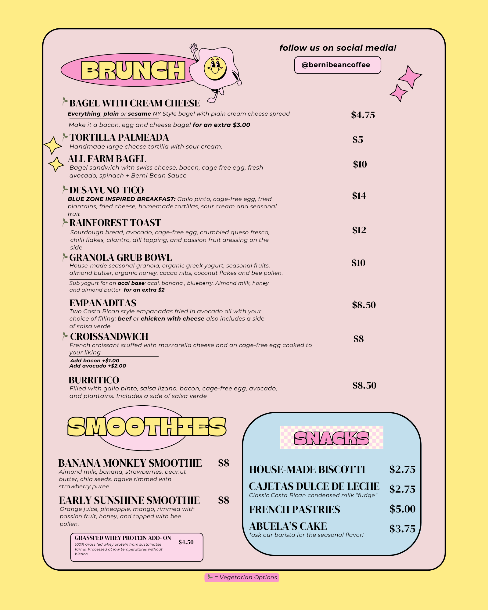 Pre order ahead Food $14.00 Desayuno gallo pinto, tortilla, fried plantains, fried cheese, scrambled eggs and fruit $14.00 $4.75 Bagels + cream cheese $4.75 $10.00 All-Farm Bagel - your choice of bagel with melted swiss cheese, scrambled egg, avocado, spinach, bacon and berni bean sauce (cilantro sauce) $10.00 Rainforest Toast $12 Surdough bread with fresh avocado, queso fresco, chilli flakes, cilantro, egg, seasonal topping and lemon zest. $12 $10.00 Granola Grub Bowl -Organic greek yogurt, home-made granola, seasonal fruits, honey, almond butter and cacao nibs. $10.00 $8.50 for 2 Empanadas Fried Costa Rican style empanadas with queso fresco + chicken or beef. $8.50 for 2 $8.00 Croissandwich with Egg & Cheese $8.00 Option to add bacon for extra Cake of the week 3.75 French Pastries 5.00 $2.50 Cajetas de Dulce de Leche $2.50